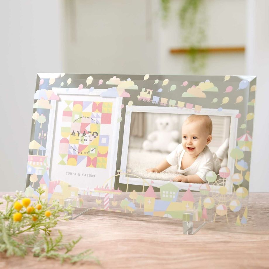 透明感あふれるガラスには、お子さまの誕生をかわいい動物たちが祝福してくれているようなかわいいデザインやパステルカラーのポップでたのしい遊園地デザインをUV印刷しました。