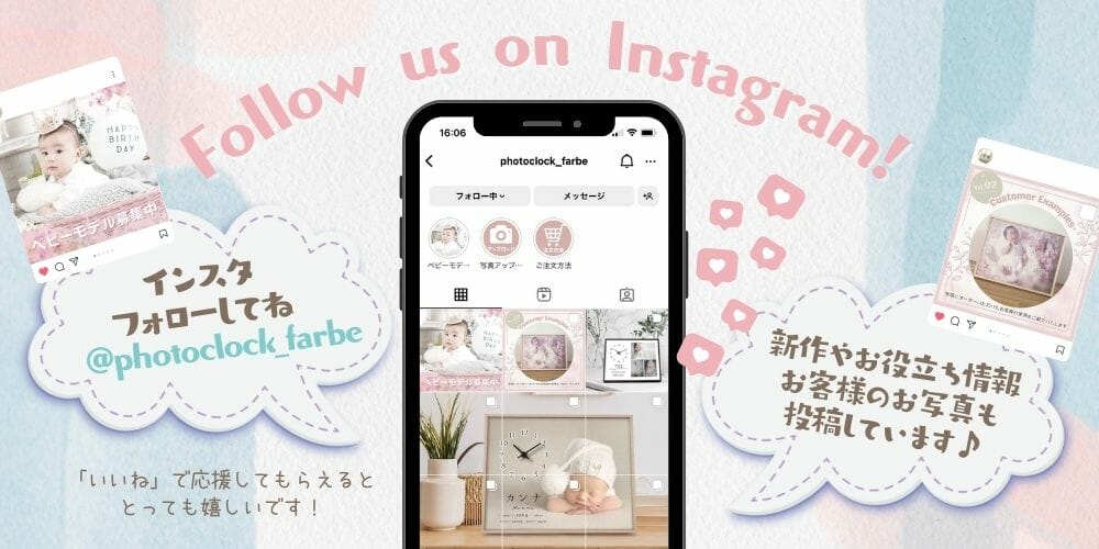 文字盤の全面にお写真をレイアウトしたおしゃれな時計付き命名書。
