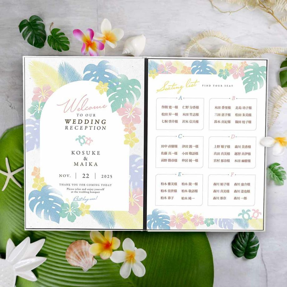 出発前に事前にご用意して、ゲストの皆さまにお配りするタイプで、スケジュールや観光マップ、おふたりのプロフィールはもちろん、当日参加いただくゲスト紹介&席次表付きでワンランク上のおもてなしアイテムです(*´ω`)