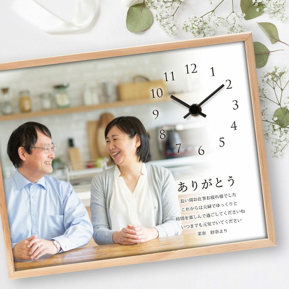 結婚式で撮影してもらった家族との写真で作成して、後日プレゼントとして渡すアイデアもオススメ!当日、プロのカメラマンさんに家族ショットを撮影してもらうといいかもしれませんね。お好みで、「Thank you」や「ありがとう」などの文字や、メッセージ、お名前なども入れることができますし、逆にシンプルに写真と時計だけという選択も可能です。