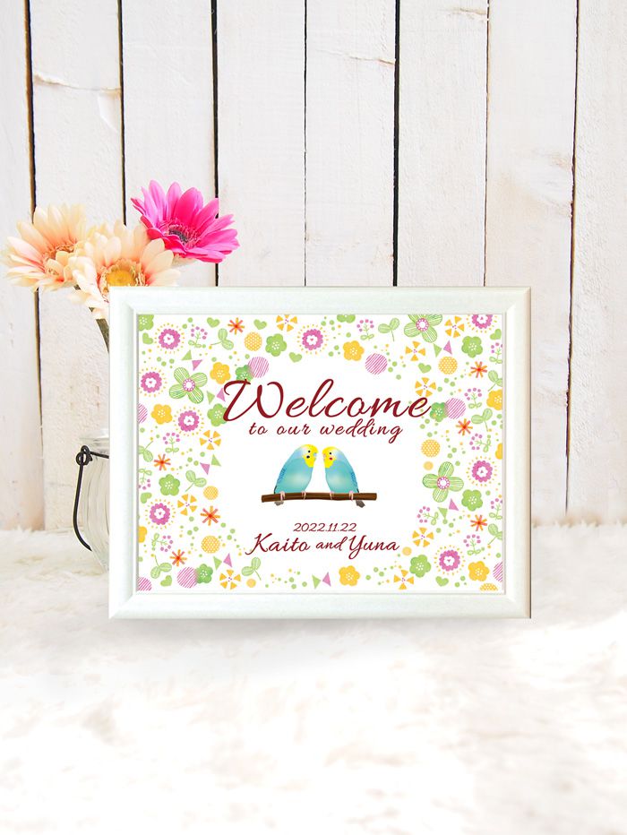 セキセイインコをテーマに結婚式をするなら、結婚の報告も同じデザインで。最後までぬかりなく好きを表現しよう♡