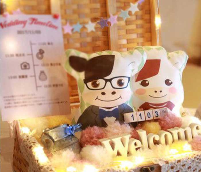 愛らしい表情がとっても素敵!!こちらのウェルカムトランクの牛さんクッションは、なんとアイロンプリントを利用してDIYされたそう。手作りとは思えない、完成度の高さです。