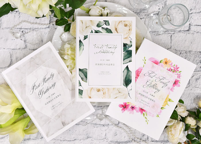 料亭での顔合わせ会なら和風デザイン、ホテルならシンプルに、レストランならイマドキおしゃれデザインなど会場の雰囲気にあわせて選ぶこともできます。