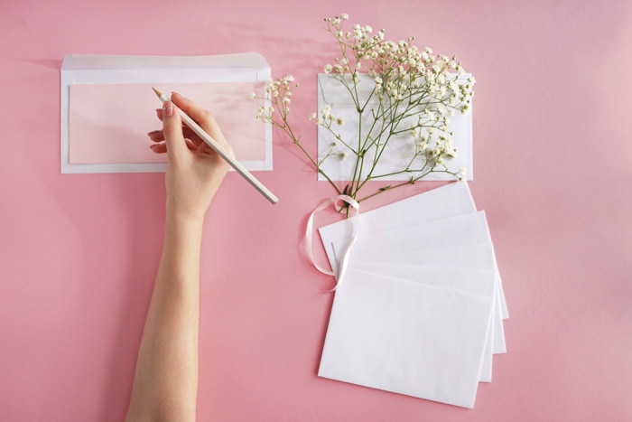 ピンク色の便せんにペンで文字を書こうとしている横にはカスミソウと白い便せんが数枚置かれている