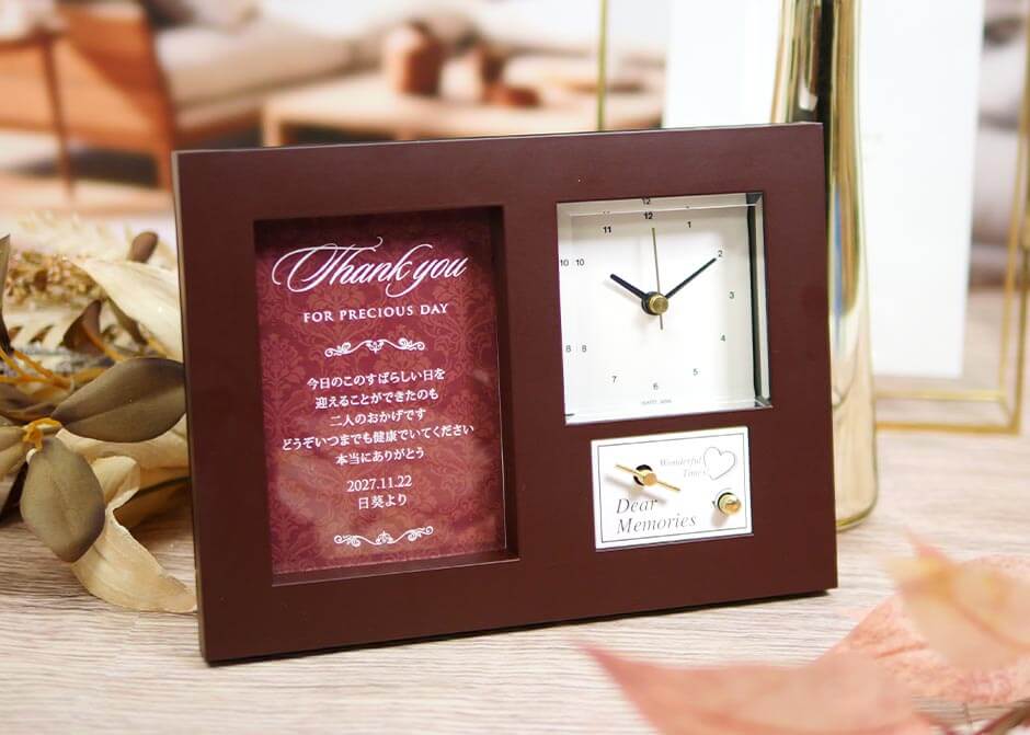 シンプルでおしゃれなデザインが気に入りました。メッセージカードも、自分の言葉で感謝の気持ちを伝えられました。時計としても使えるので実用的です。オルゴールの曲が流れるたびに、結婚式の思い出が蘇ると両親も喜んでくれました。