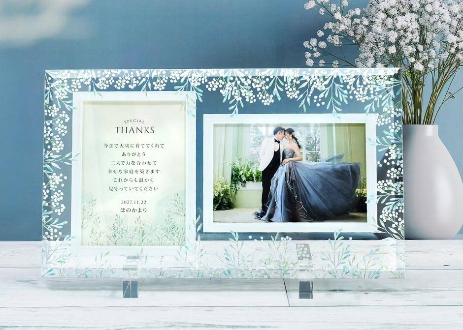 オリジナルのメッセージも入れられて、デザインもシンプルでおしゃれ。サイズも大きすぎないのが良かったです。写真も入れ替えが簡単で前撮りの写真をセットしてプレゼントしました。両親も写真を入れ替えながら飾れるのが嬉しいと喜んでくれました。