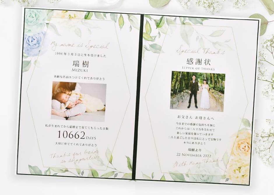 言葉でうまく伝える自信がない…という方はコレ。あなたのお名前を大きくレイアウトし「素敵な名前をつけてくれてありがとう」からはじまる感動の感謝状。お写真は2枚入るので、子供の頃の思い出のお写真と前撮り写真を入れて。これまでの感謝をたっぷりつめこんだまるで表彰状のような感謝状です。かさばらないので持ち運びにも便利です。