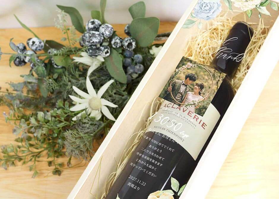 私達2人がワイン好き、両家両親もお酒好きで、生まれ年のワインを贈りました。感謝の気持ちを伝えるのに自分の言葉を贈れること、小さい頃の写真が入れられたこと、生まれてから結婚式までの日数が入れられたことも本当に良かったです。