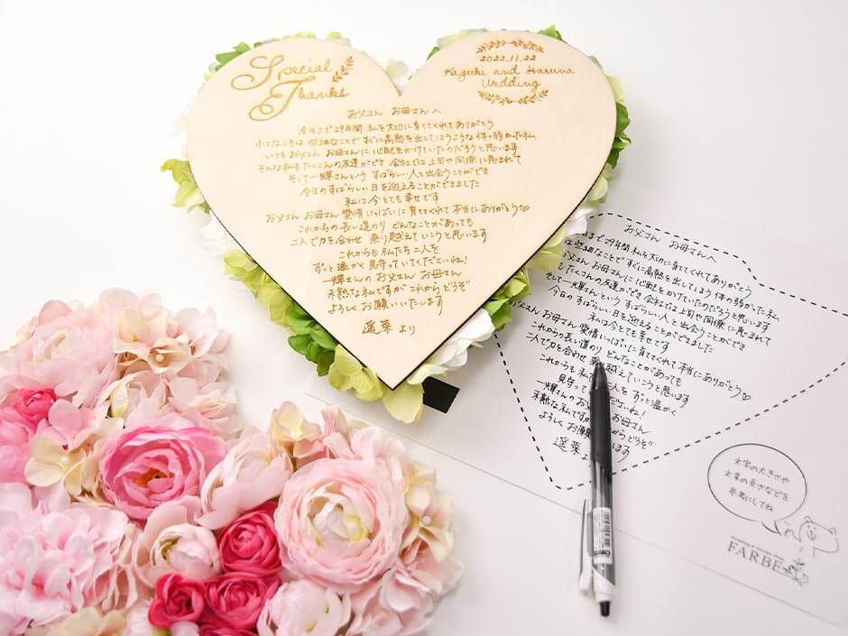ハート型のボードに直筆メッセージをレーザー刻印し、裏面はアーティフィシャルフラワーで装飾されたお手紙アイテム。