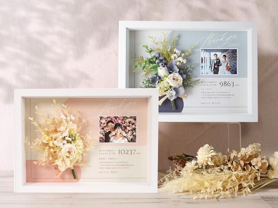 花束の代わりに渡せるブーケアレンジ付きの子育て感謝状。お写真とオリジナルのメッセージ、生まれてから結婚式の日までのカウント日数も入るので、言葉だけでなく数字にもこれまでの感謝の気持ちをこめて贈ることができます。