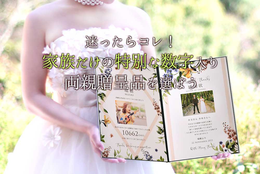 結婚式の両親贈呈品、たくさん種類があるし、どれも良く見えてくるから、迷ってしまうとどれにしたらいいかなかなか決められないですよね?そんな時は「家族だけの特別な数字が入ったもの」を選んでみるのはいかが?さて、それはどんな数字が入ったものなのか?早速チェックしていきましょう!