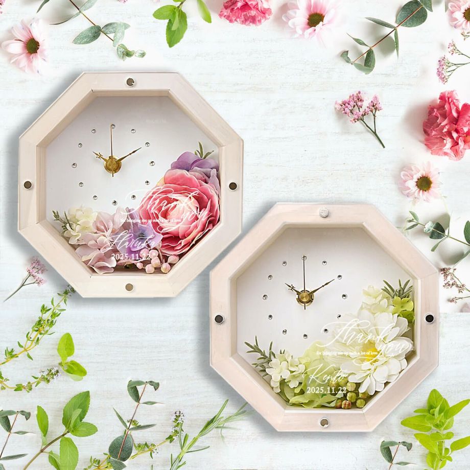 「末広がり」で縁起のいいフォルム、幸せを招く形と言われる八角形の時計。小ぶりなのにぱっと華やぐフラワーアレンジで見るたびに幸せになる特別な時計は、実用性だけじゃなく華やかさも兼ね備えた記念に残せる贈呈品です。可愛らしい「ローザ」、ナチュラルな「ピューレ」お好きなアレンジをお選びいただけます。
