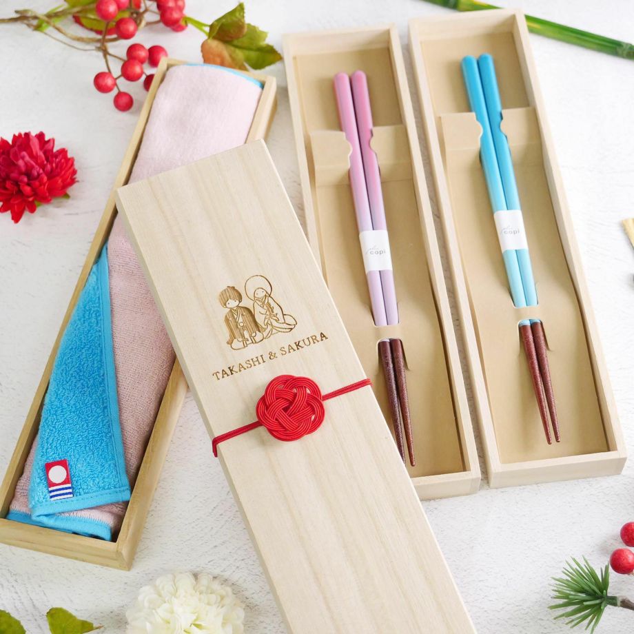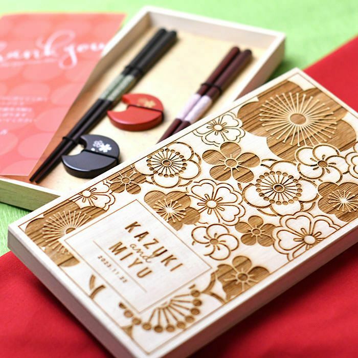 縁起物のお箸を特別な桐箱に入れたギフトセット。あらゆるギフトシーンにも使えるセンスの良いワンランク上の贈り物です。細部にわたって丁寧に美しいデザインのレーザー彫刻がほどこされています。お二人のお名前と日付入りだから記念の品としても最適。桐箱をとめる赤いお花模様のゴムがワンポイントになっています。