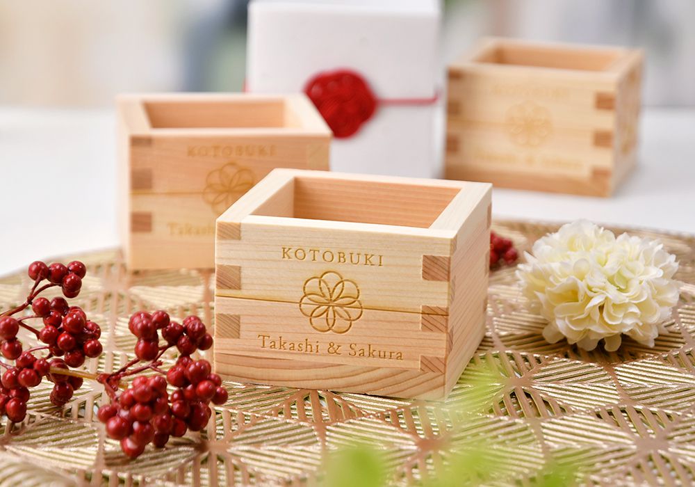愛が増す、幸せが増す、言葉の響きから縁起がいいと言われている「枡(ます)」のギフト。ご両家が初めて顔をあわせる会の記念の品としてぴったりな縁起物。ちょっとした小物入れや食器として使える、お祝いの席にふさわしい結ギフトです。