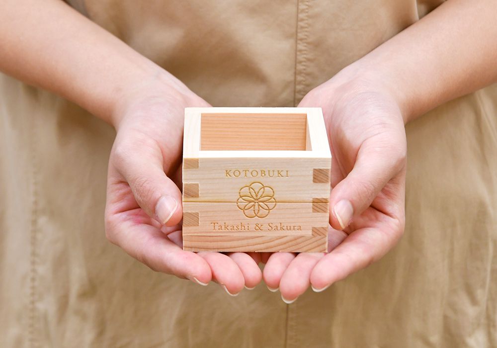 サイズは5勺。一合枡のほぼ半分の容量(100ml)が入る大きさ。枡は小物入れや食器として使えるので、お父さんは晩酌に、お母さんはお花を入れて…など全員お揃いの記念品をそれぞれの使い方で楽しんでいただけます。新居の玄関に置いて印鑑の置き場所に、なんて使い方もおススメ!