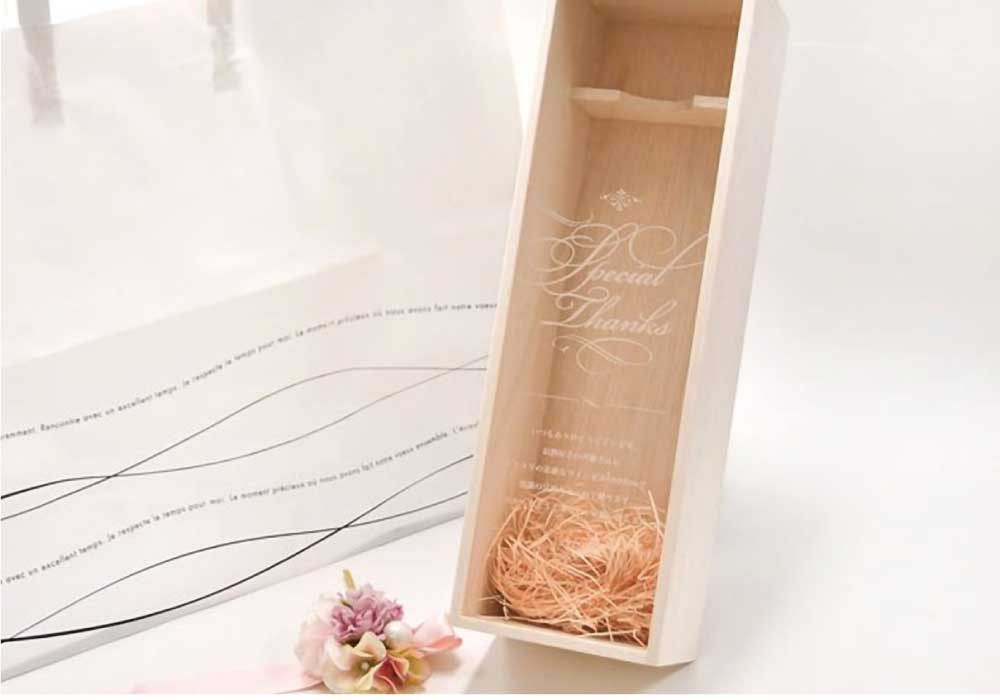 こちらは木箱にスライド式のアクリル蓋をセットしたもので、ワインのボディ全体が透けて見えるようになっています。アクリル蓋にはメッセージがレーザー彫刻されます。