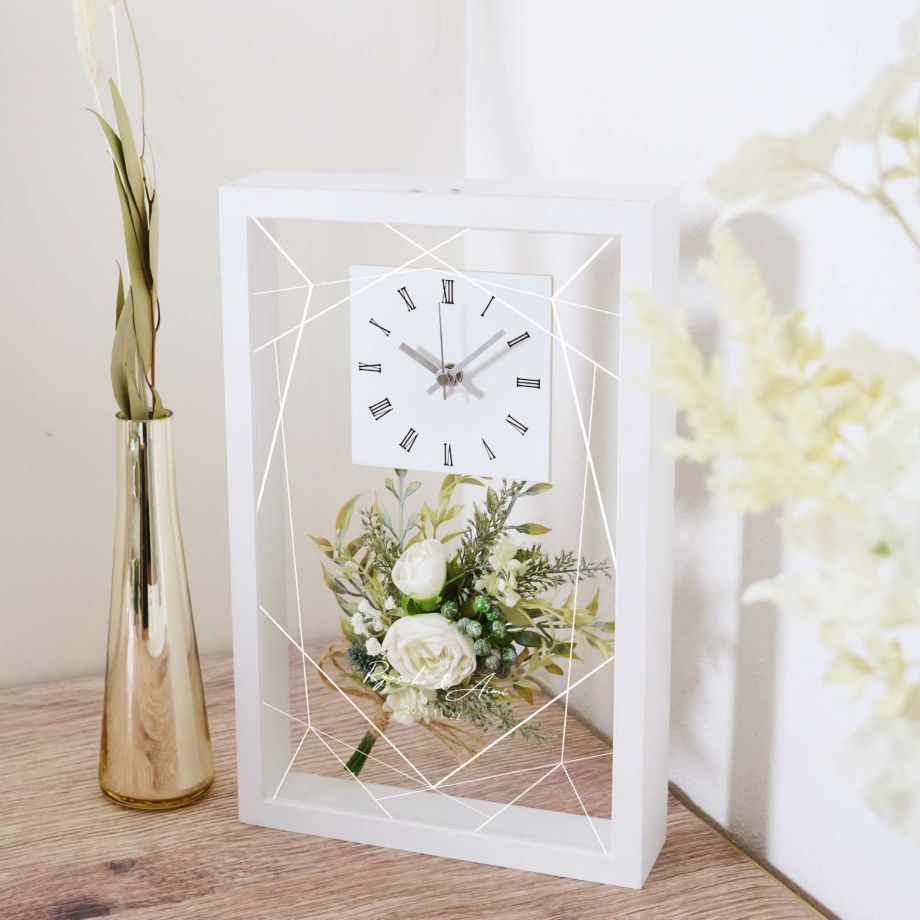 背面までクリアなデザインにブーケを入れた、華やかでおしゃれな時計ギフトです。シンプルかつスタイリッシュなホワイトクロックは、透明感が際立ち、光や周りの色調によってさまざまな表情を見せます。