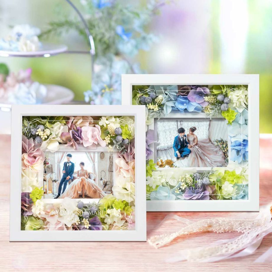 瑞々しい生花をリアルに表現した枯れないお花、アーティフィシャルフラワーを使用したいつまでも記念に残せるスクエア型ボックスお花付き写真立て。華やかなお花とともに常に思い出をアップデートできます。