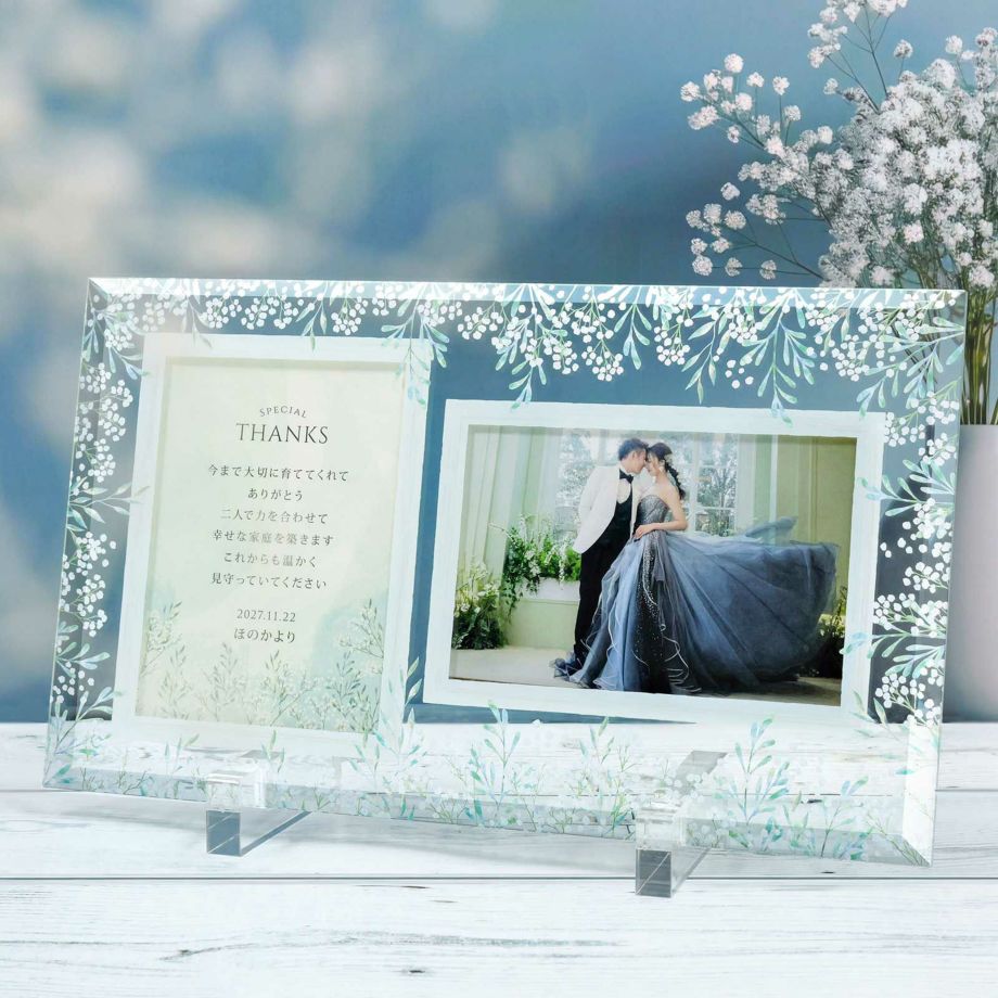 おしゃれなお花のデザインをUV印刷したガラスのフォトフレーム。お写真は自分でセットできるから、写真を送るのが大変…など手間なく商品が届いてからゆっくり好きな写真を選んでご使用いただけます。実際にお写真を入れてみてどれがいいかな、と選べるのもうれしいポイントです。ご両親とお揃いで自分たちの記念用にもおすすめです。