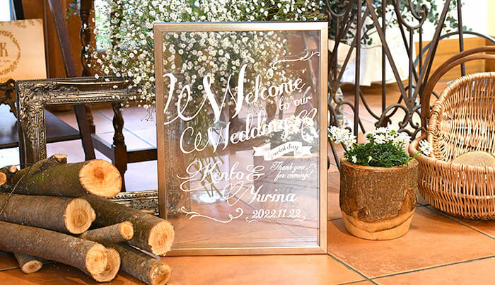 挟んで仕上げた、透け感が美しいウェルカムボード。ウェルカムスペースがランクアップします。
