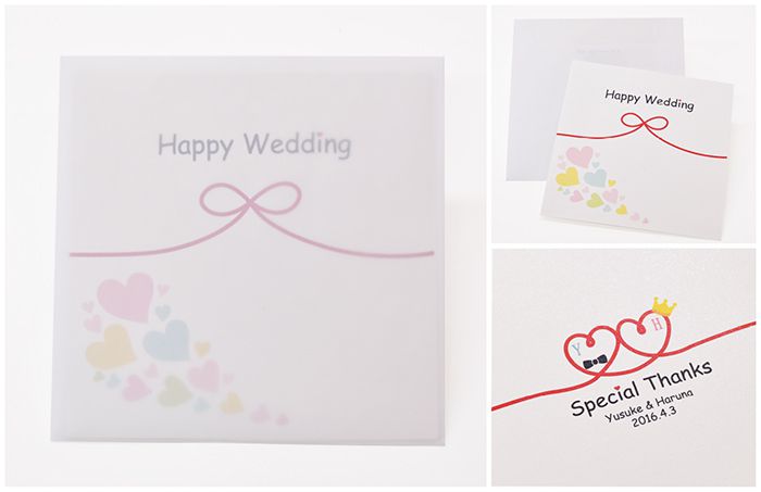 F様のご希望内容は、スクエア型の招待状。ハートをモチーフにかわいく仕上がりました。