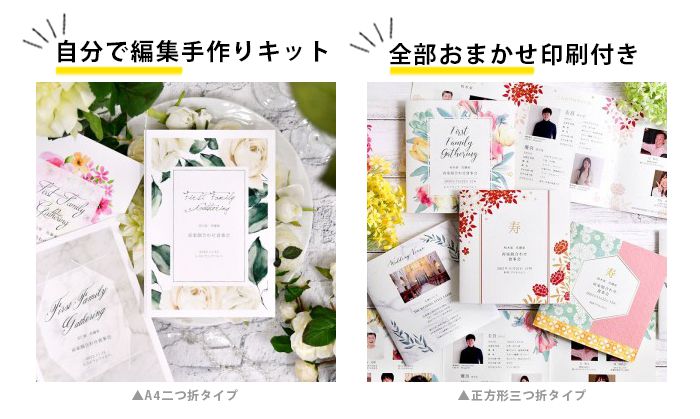 手作りキット、印刷込みオーダータイプ どちらも表紙に「顔合わせ食事会」と入りますが、