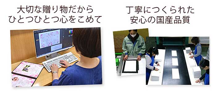 お預かりしたお写真やデータは経験豊富な専任スタッフが厳しくチェック。文字間違いがないよう徹底して校正し、丁寧に色合わせやトリミングをし、どんなに小さなキズも厳しくチェック。光沢感のあるフォト専用紙に印刷し、最後まで心をこめてお作りしています。写真カバーとして採用している2面台紙は国内メーカーさんで作られたもの。見えないところにも徹底したこだわりがつまっています。専用箱におさめて大切に大切にお届けしていますので、安心してご注文くださいませ♡
