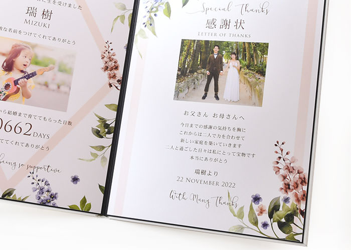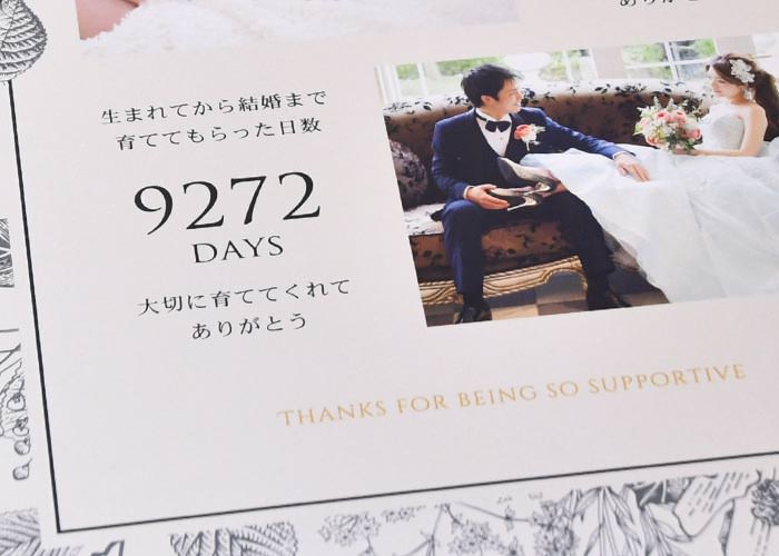 ここに入る数字は、生まれてから結婚までの日数をカウントしたものです。こうして数字にあらわすことによって、家族と過ごした一日一日の日々の積み重ねを感じることができ、深い感謝の気持ちが伝わりそうですよね。