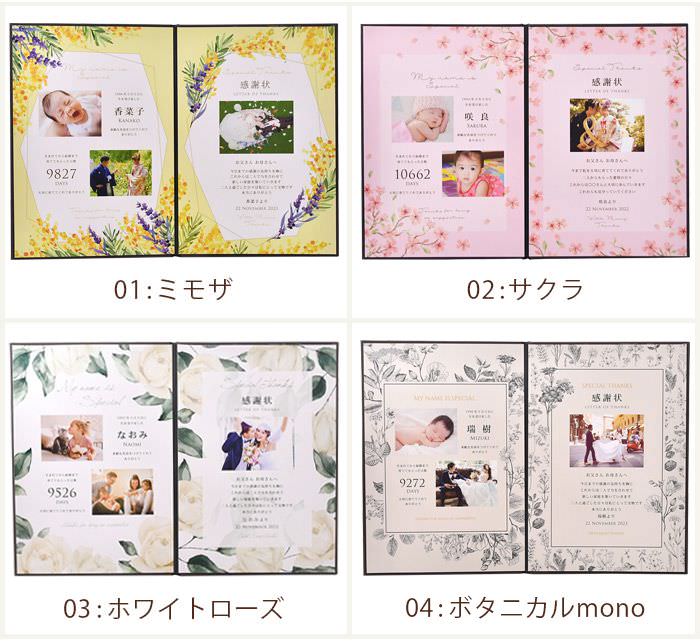 現在発売されている「メモリアル」シリーズの子育て感謝状はこちら。表紙カラーや中のデザイン、入るお写真の枚数、価格などが異なるので、こちらはお好みに合わせて選んでいただけるようになっています。