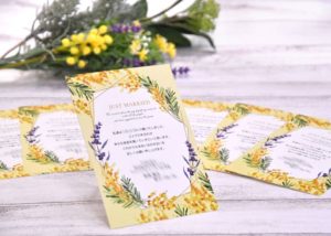 【オリジナル実例集】明るいイエロー&ミモザ柄で幸せのご報告♡入籍報告はがき