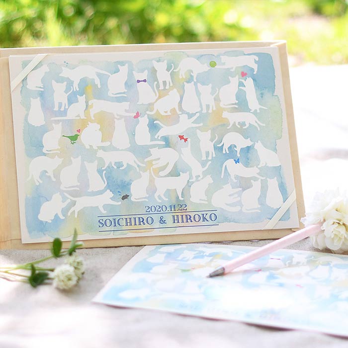さらにこちらのように、シートのイラストに記入していただくタイプもあります。ゲストのお名前で完成させる寄せ書きアイテムは、ゲスト参加型の演出に!