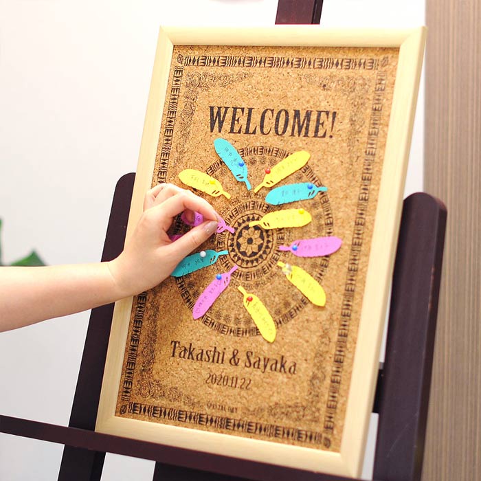 たとえばこちらは、お名前を書いてコルクボードにピンでとめるだけ。ゲストの緊張もほぐれるような受付スペースになります。