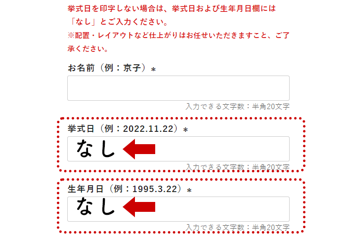 ファルベのアイテムを日付や日数なしで作るには、ご注文の際、挙式日入力欄や生年月日欄に「なし」とご入力ください。