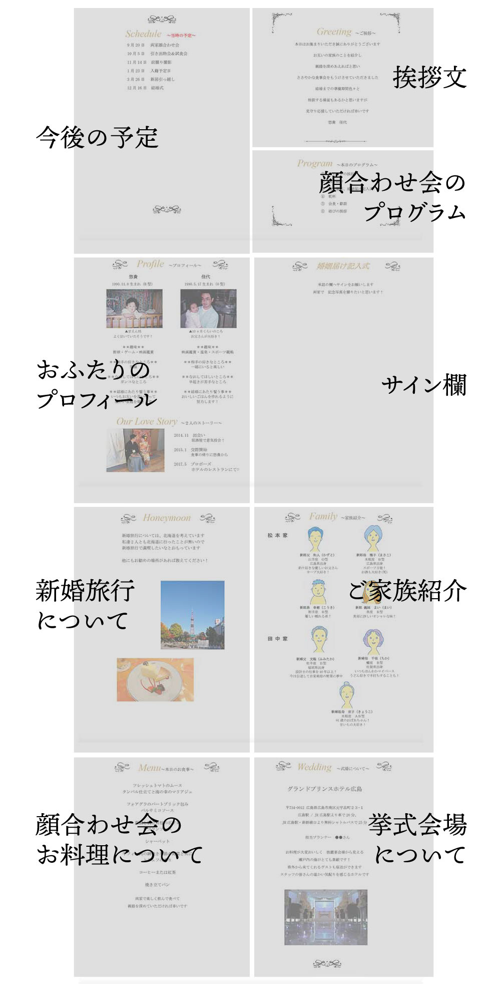 プロフィールや当日の進行、式場のことなどあったらいい!と思われる内容が事前にレイアウトされているからそれをそのまま使ってもよし、参考にして自分なりに工夫してもよし!