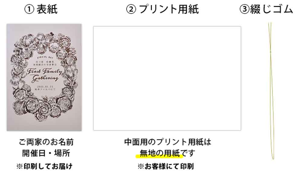 まずはオンラインショップでキットセットを購入!表紙紙にプリントする必要な情報を入力して、和洋14種類の豊富なデザインから好きなものを選んだら注文完了♡