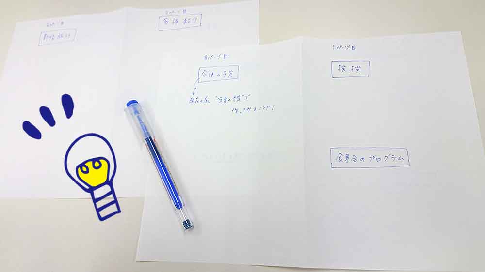 用紙が2枚の場合、どの編集ページとどの編集ページを組み合わして印刷するのか間違えないようにしましょう!印刷する前に、データと構成案のページ順が間違っていないか、照らし合わせて確認すると安心です!