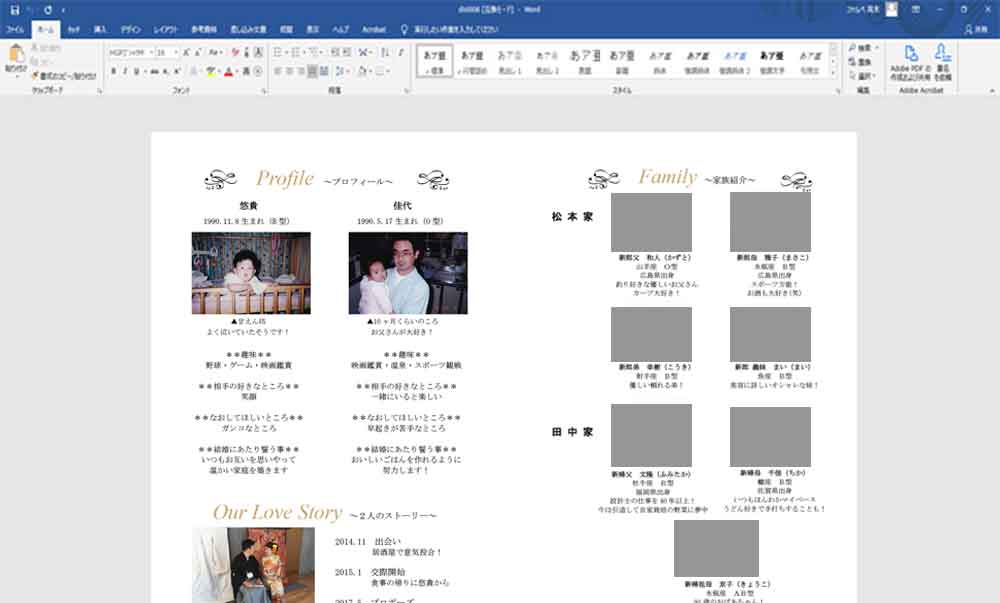 それでは、表面・中面・裏面と入れる内容を考えてみましょう。テンプレートはMicrosoft Word形式になっているから普段オフィスで使う感覚でできそう♡
