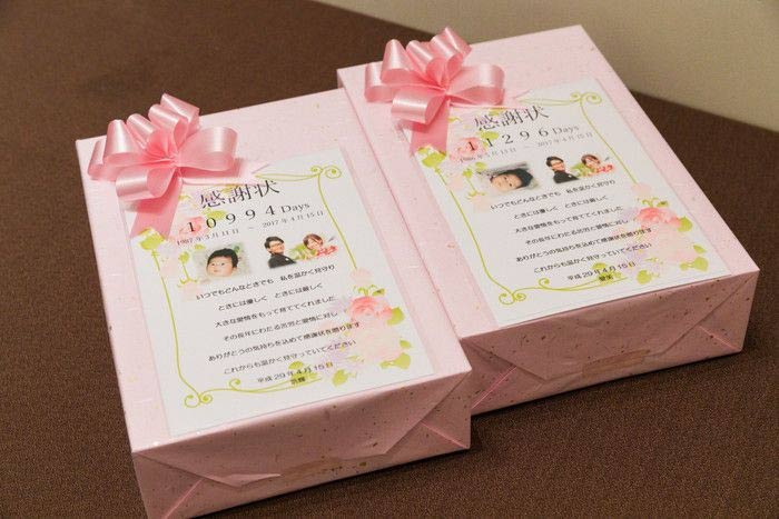 既製品をそのままではなく、ラッピングされ、子育て感謝状も添えて贈られました。