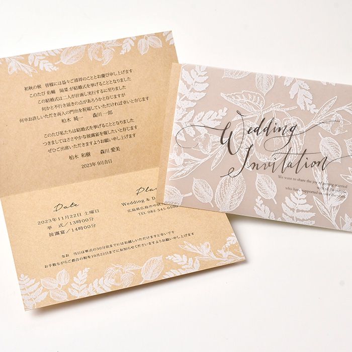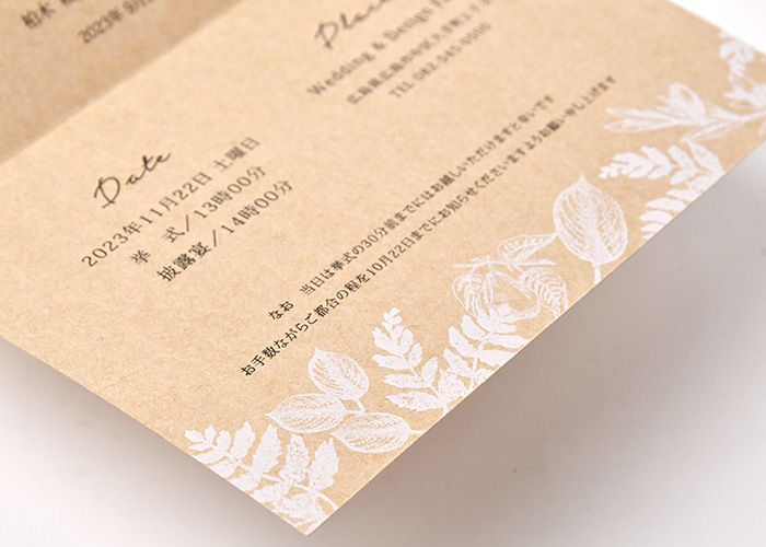 こちらの招待状は、トレンドマテリアルのクラフト紙をトレーシングペーパーで作られたスリーブに通し、ボタニカルなデザインを本状にもスリーブにもホワイトプリントであしらった、おうちプリンターではなかなか叶わない3強のデザインです!