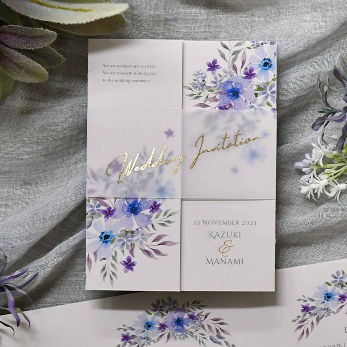 開き観音折りと巻三つ折りのいいとこドリな折りで、開くワクワクと個性的な表情、広々とした中面の使い方が可能なスタイルの招待状です。可憐で清楚なフラワーデザインが大人の結婚式を演出します。