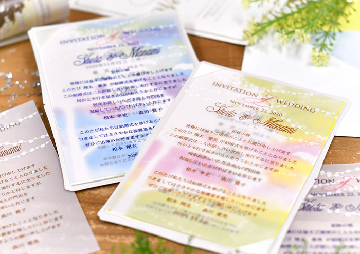 カラフルなデザインペーパーに、重ね効果抜群のプリントトレーシングペーパーをリボンに差し込んで留めるスタイル。水彩画調デザインで華やかかつ幻想的に演出します。カラーはピンクorブルーの2色からチョイスして。