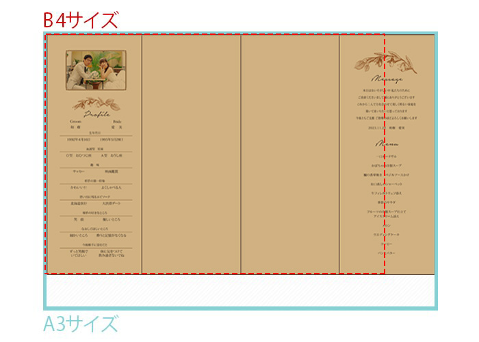 A3より小さくB4より大きい257×420mmの席次表には、オールインで理想が叶う内容がしっかり盛り込めるレイアウトになっています。