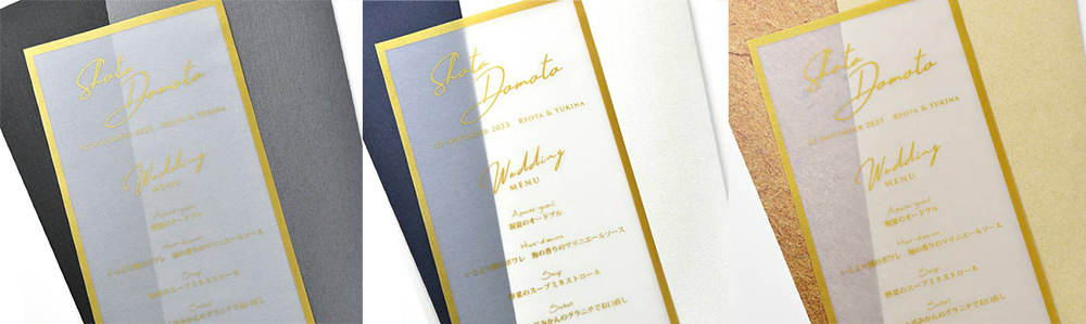 トレーシングペーパーとホワイトプリントの相性を抜群に感じさせる席札メニュー表。手に取ったときのさらさらとしたすりガラスのような質感が、見た目に上品さをプラスします。