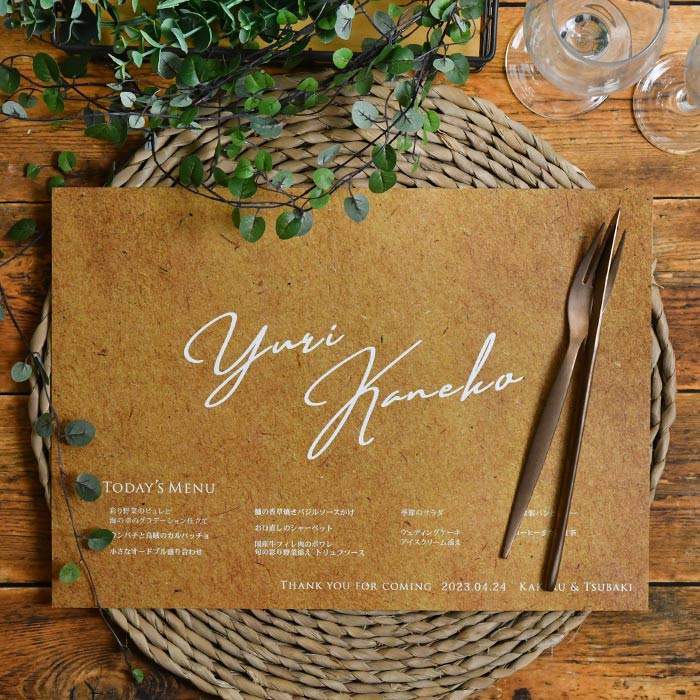 ↑使用例:ペーパーランチョンマット席札デザインAメニュー付【クラフト風】/結婚式