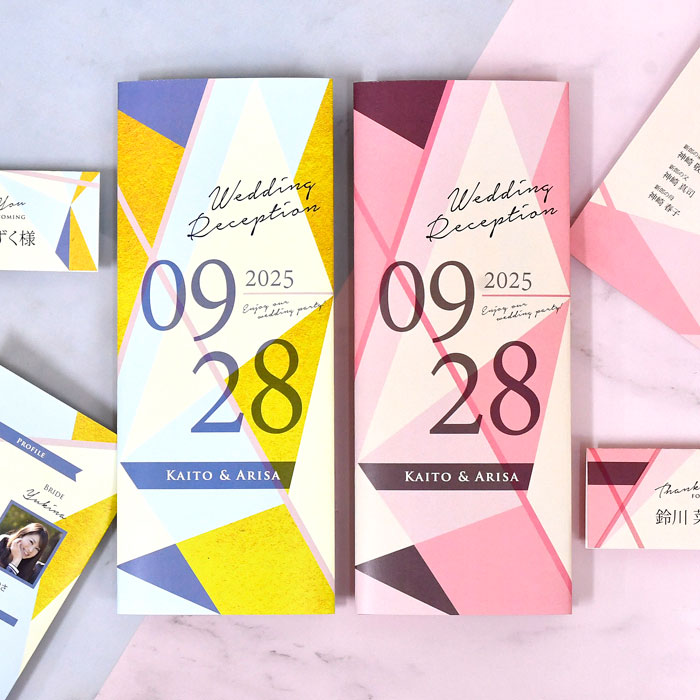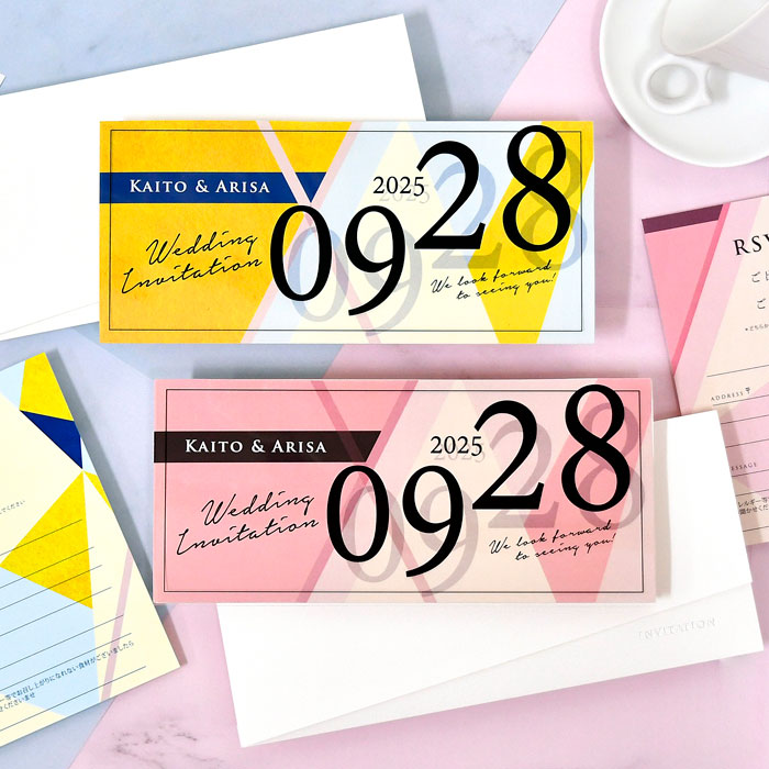 ミッドセンチュリーを思わせるカラフルな幾何学柄は、ブルーとピンクの2色から。新郎側はブルー&新婦側はピンクにしたり、ゲストによって色を変えたり出来ます。最小注文部数は20部からですが、少人数婚の場合はロット割れオプションで対応可能なので、結婚式にはもちろん、おしゃれなパーティでも取り入れたくなる招待状です。