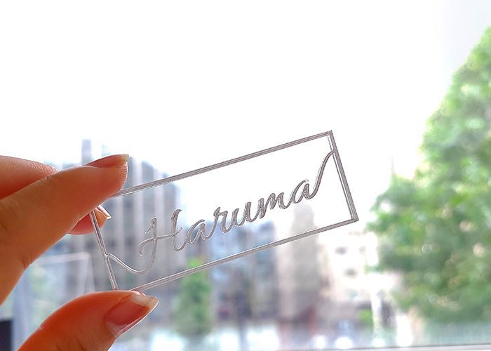 クリアな貝殻型のアクリルにお名前をレーザー彫刻しています。