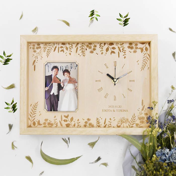 フォトフレームをINした、あたたかみのある木の素材を使った時計は贈り物にふさわしいぬくもり。ナチュラルリーフのデザイン柄をレーザー彫刻で刻んでいます。三家族おそろいで用意すれば、離れていても同じ時を刻んでいけます。