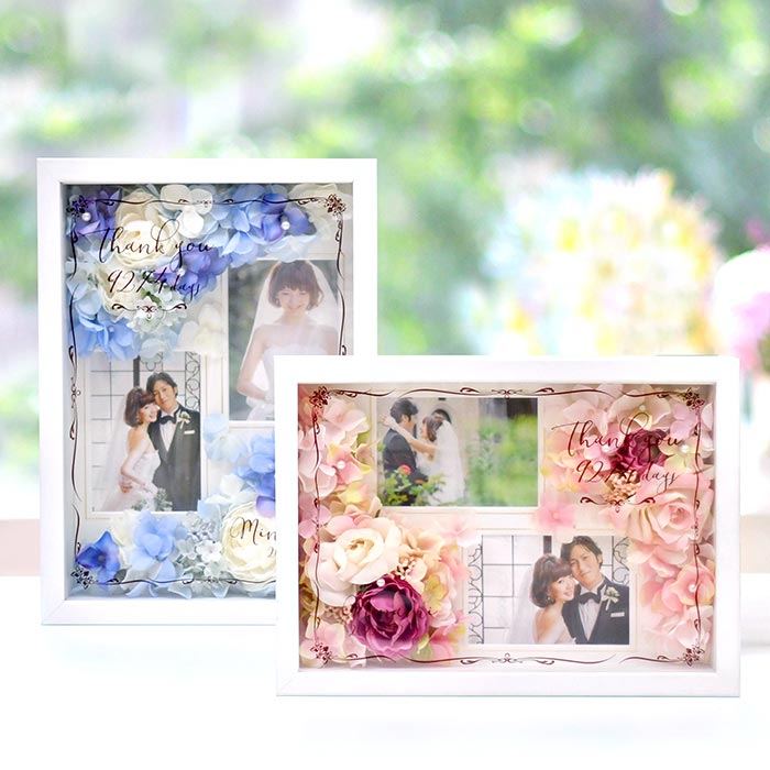 3つの家族が同じ時を刻むお揃いのフォトフレーム付き花時計。デザインはフラワーアレンジ10種類から選べるから、3つ同じにしても、違うアレンジを選んでもOK。それぞれに日付とお二人のお名前が入ります。