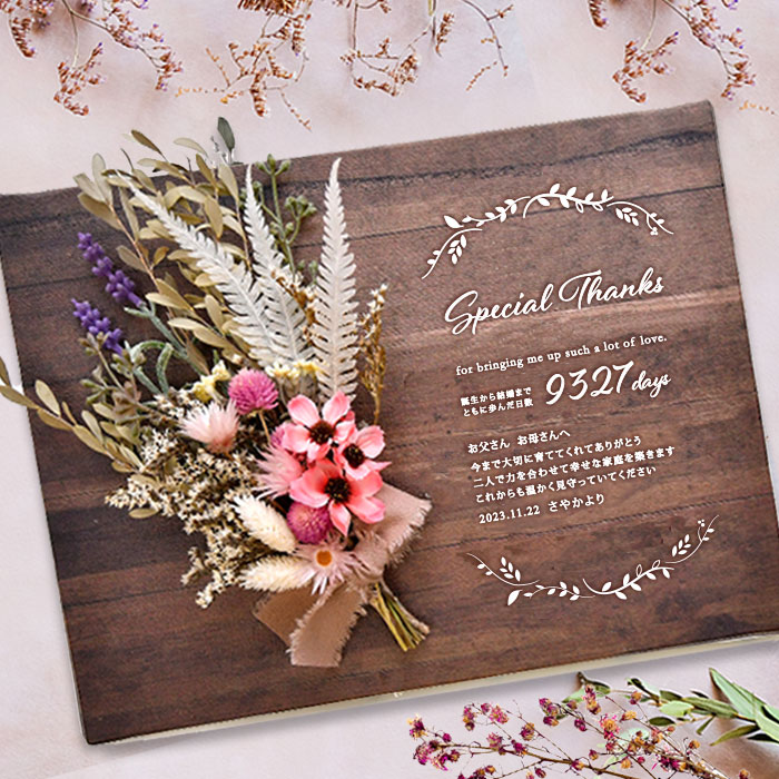 感謝の思いを込めて贈るキャンバスタイプの子育て感謝状。ウッド調模様のキャンバス地は流行りのドライとの組み合わせが相性バツグン。スワッグブーケのアレンジがおしゃれに感謝の気持ちを伝えてくれます。挙式日印字なしも対応可能。