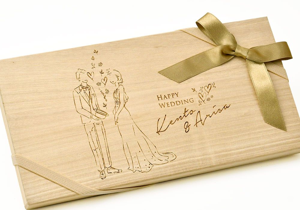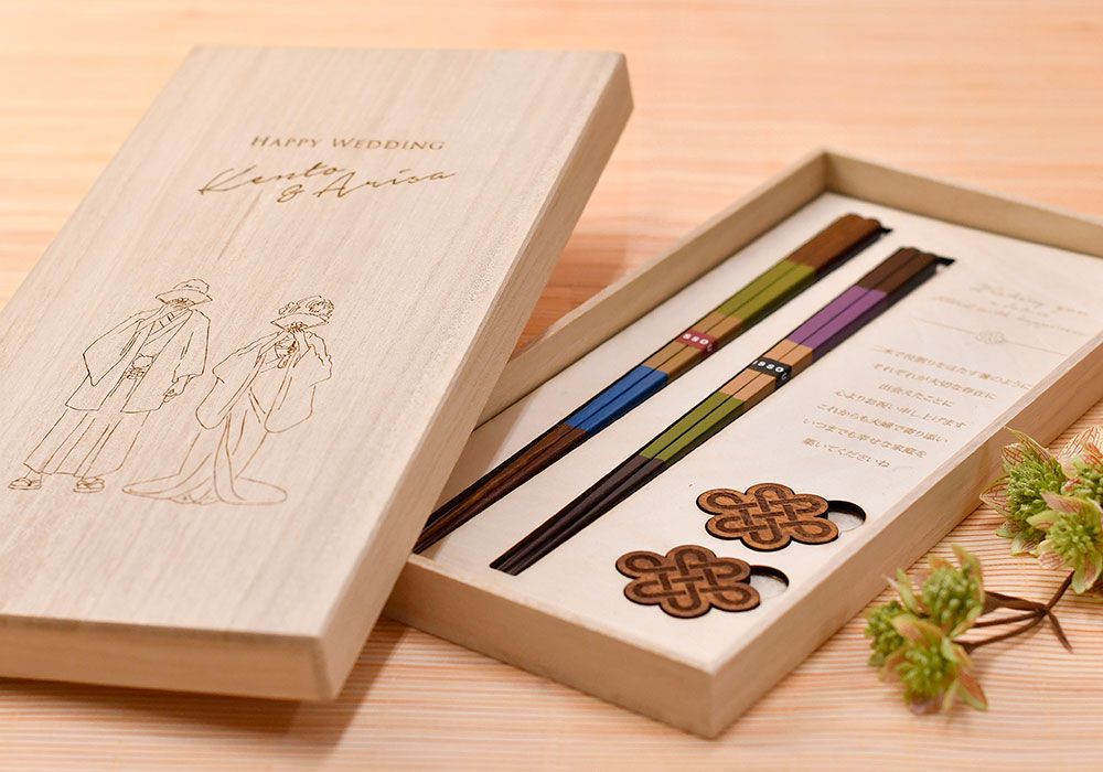 桐箱の蓋面におしゃれな新郎新婦の線画イラストを彫刻した、結婚のお祝いギフトにぴったりな夫婦箸の贈り物が新登場!